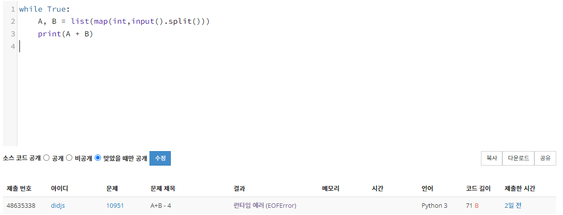 수가 입력되지 않아서 에러가 발생할 시에 반복문을 끝낼 수 있도록 try - except 구문을 활용.