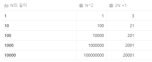 array의 길이 X array의 길이 X 비교 연산 1번 만큼의 시간이 필요하다. 여기서 array(입력값)의 길이는 보통 N이라고 표현해 N * N, 즉, N^2 만큼의 시간이 걸렸다고 표현할 수 있다.
