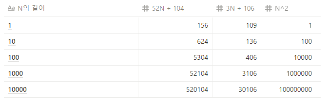 - 위에서 연산된 것들을 더해보면, N * (1 + 2) + 2 + 26 * (1 + 3) = 3N + 106