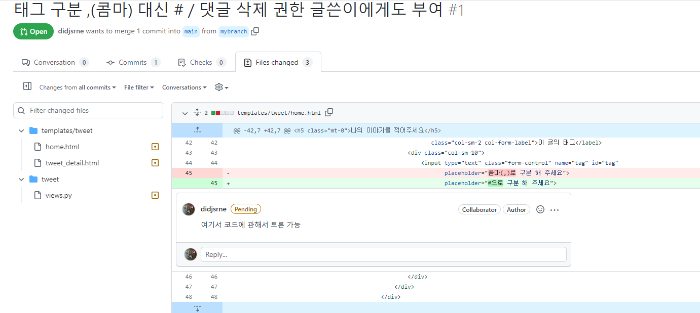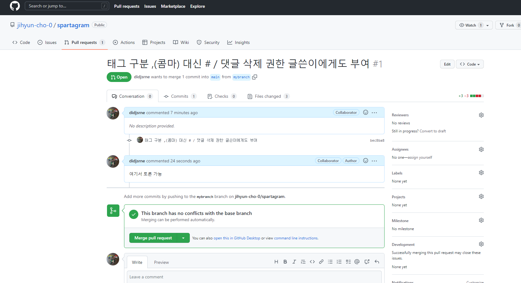 실제로 협업에 사용하는 첫번째 pull request였다 ㅋㅋ