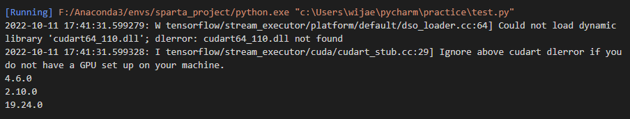 오류코드를 보아하니 cudart64_110.dll이라는 파일이 없어서 텐서플로를 구동하는데 GPU를 쓸 수 없는것 같다..