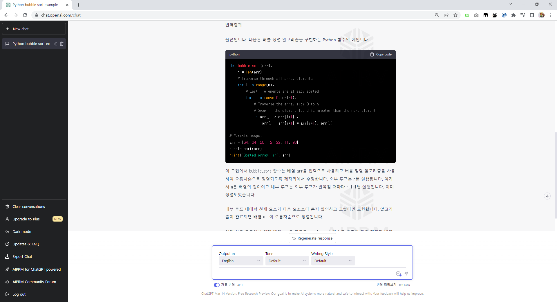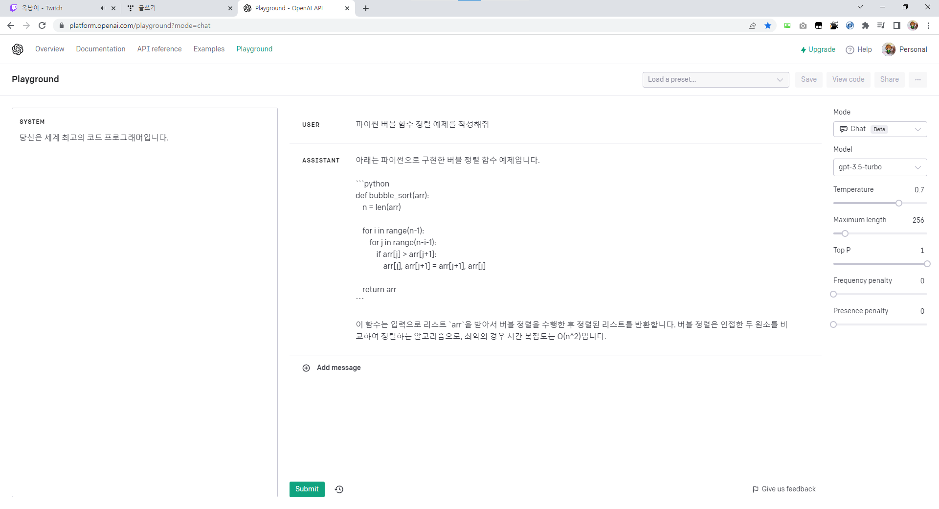 프롬프트를 통한 역할 부여를 하지 않더라도 ChatGPT는 코드에 대한 질문에 대해 답변을 잘해주는 편으로 코드가 생성되는 질문의 경우 일반페이지에서 질문을 하는 편이 나을것 같다. 까비..