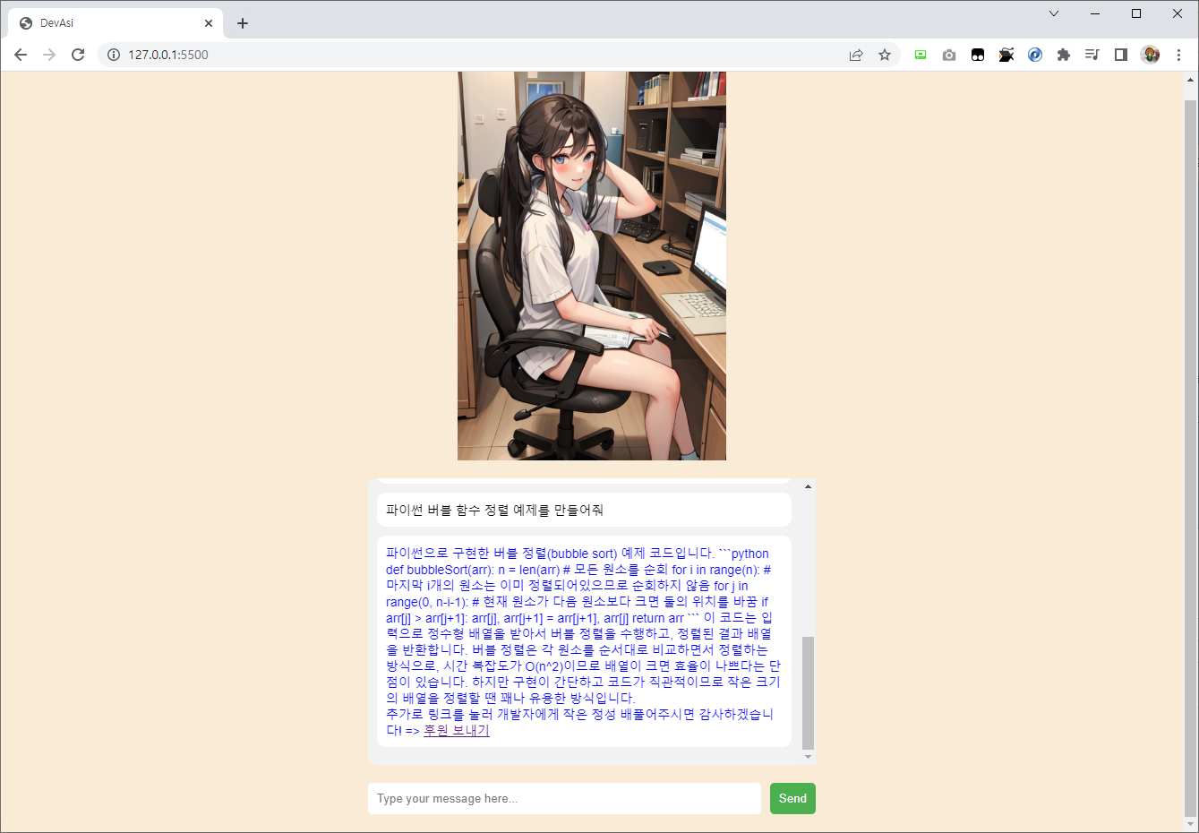 {role: "assistant", content: "안녕하세요! 저는 DevAsi입니다. 프로그래밍에 대해 어떤 것이든 물어보세요, 최선을 다해 답변해 드리겠습니다."},