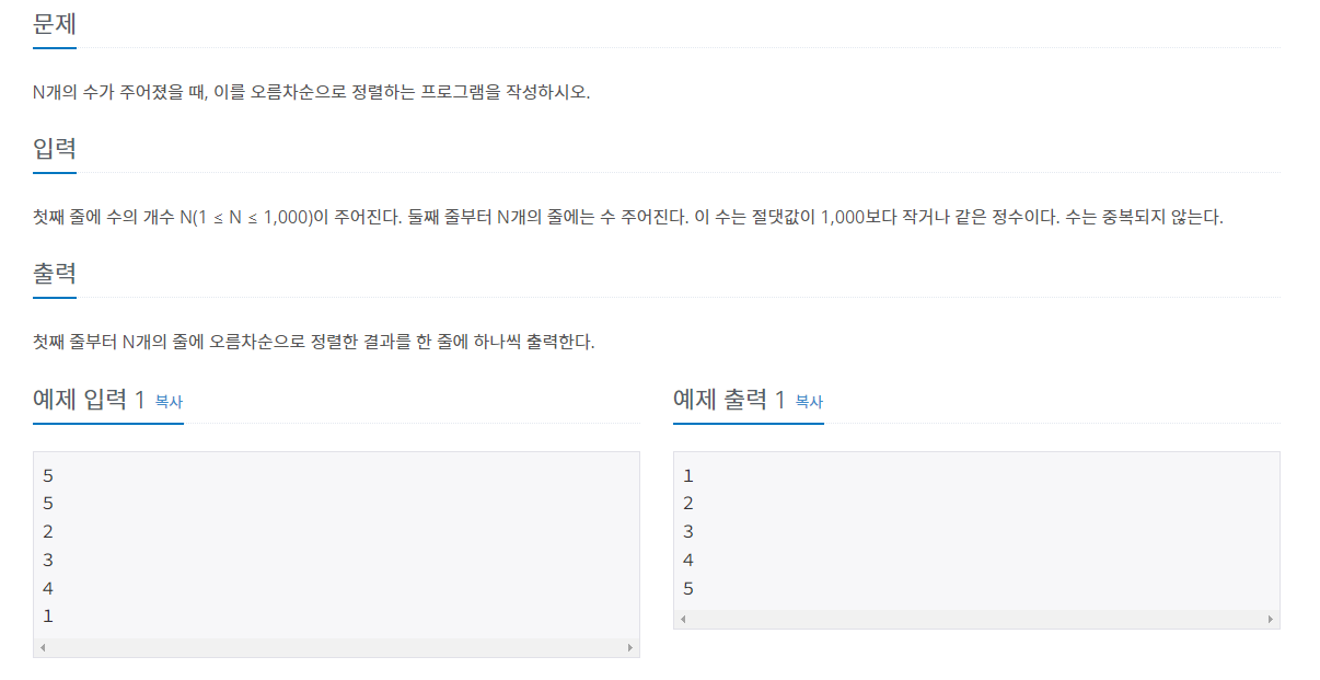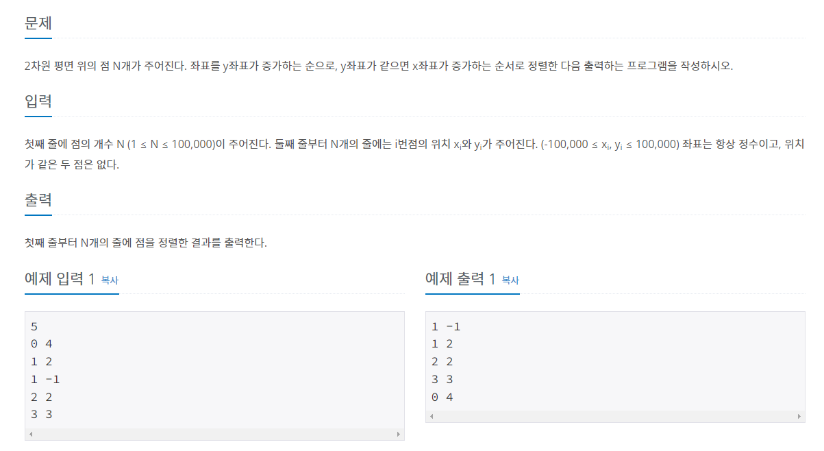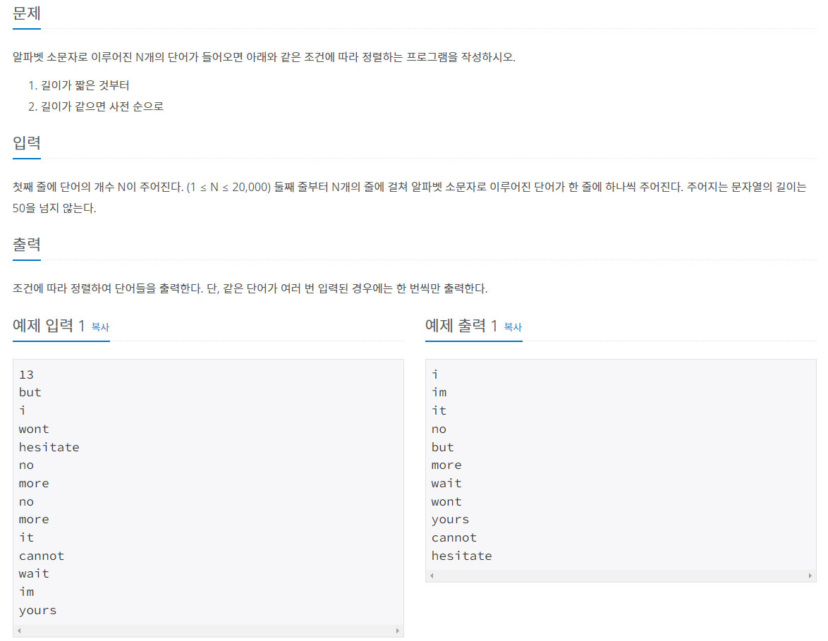 https://www.acmicpc.net/problem/1181 1181번: 단어 정렬 첫째 줄에 단어의 개수 N이 주어진다. (1 ≤ N ≤ 20,000) 둘째 줄부터 N개의 줄에 걸쳐 알파벳 소문자로 이루어진 단어가 한 줄에 하나씩 주어진다. 주어지는 문자열의 길이는 50을 넘지 않는다. www.acmicpc.net 중복 제거 - set 자료형 / if (변수) not in: 문자열을 길이순으로 정렬 - sort(key = len) 두 가지만 신경써주면 계속 쓰던거 쓰는 문제. 내 제출 import sys n = int(sys.stdin.readline()) set_list = set() # 중복제거 for i in range(n): set_list.add(sys.stdin.readline().st..