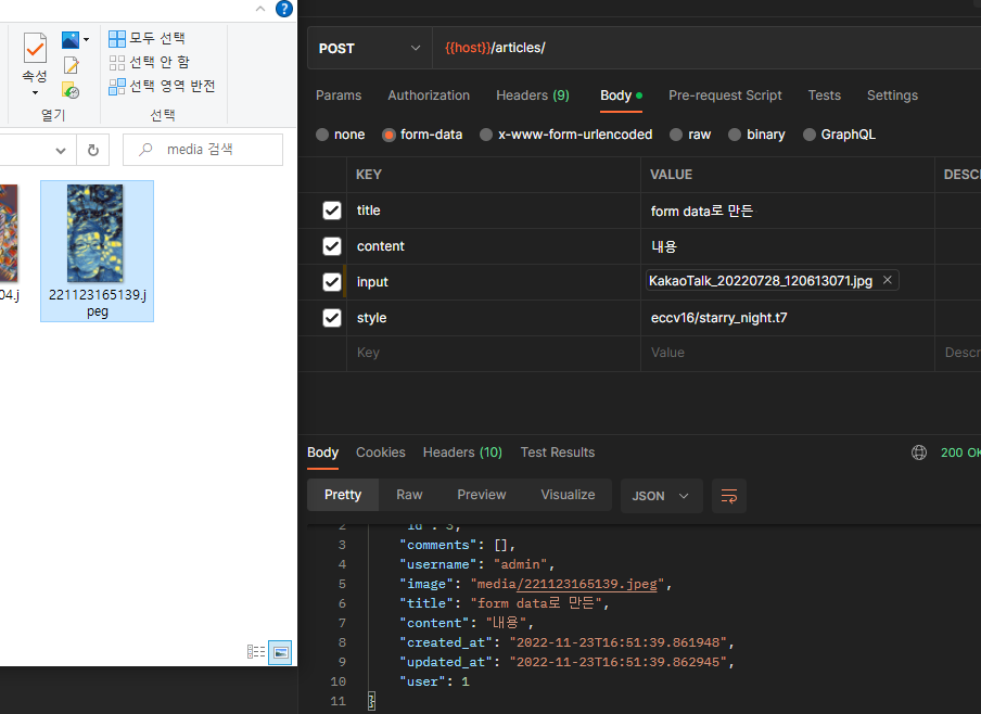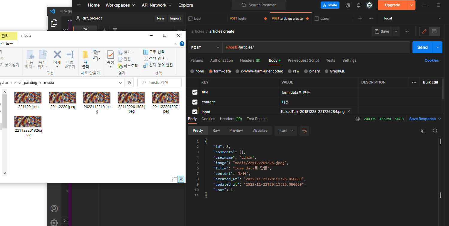 오늘의 한 일 유화 제작 프로젝트 유화 제작 프로젝트 ?? 머임 왜 이미지필드 json형태로 받아와짐?? 경로로 잘 받아와져서 잘 띄워지나본데 Image 모델 만들고 Style 모델도 만들고 한게 헛짓거리였네요.. 스타일은 남겨서 아티클에 집어넣어도 괜찮겠지만 다크모드 변환 See the Pen darkmode by 야언 (@didjsrne) on CodePen. 간단하게 토글 스위치 형식으로 body의 클래스를 적용시켜 백그라운드 컬러와 폰트 컬러를 검회색 - 흰색으로 변환시켜 보았다 간편하고 괜찮은듯? 아티클 작성 모달 예시 See the Pen create_article by 야언 (@didjsrne) on CodePen. 각 radio에 style값을 value로 지정, 자바스크립트로 온클릭 이벤..