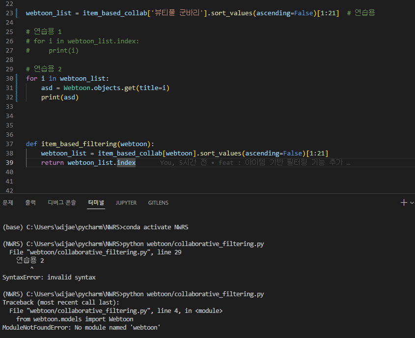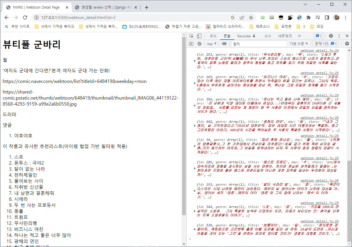 오늘의 한 일 추천 프로젝트 - 마무리, 시연영상 제작, 발표 시연 영상 https://www.youtube.com/watch?v=rAbO0dIBcmI KPT 회고 Keep 코드 컨벤션, PR컨벤션 csv파일 json화시켜서 데이터베이스에 로드(loaddata)하기, 협업 필터링 함수 실제로 돌려보고 적용시키기 Problem 협업필터링 작업중 연습용으로 적은 코드를 마무리단계까지 수정하지 않고 그대로 쓴 점 백엔드 부분에서 라이브 쉐어를 활용한 특성으로 각자 작업한 부분에 대한 커밋이 쌓인게 적다. Try 직접 api 설계 구조 따라서 코드 확인해보기 커밋, 풀리퀘스트를 더욱 활용하기 프론트엔드 페이지 url 연결 / URLSearchParams 부분 더 공부하기 초반에 백엔드부분이 생각보다 일찍 끝나고..